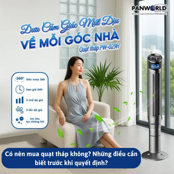 Gợi ý dành cho bạn: quạt tháp Panworld – thương hiệu uy tín với các dòng sản phẩm có ion lọc không khí, độ ồn thấp, phù hợp nhiều không gian sống từ phòng khách đến phòng ngủ.